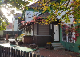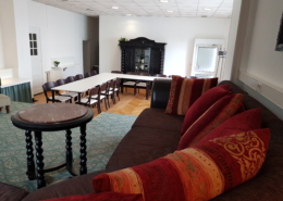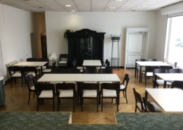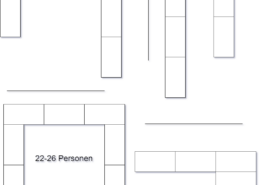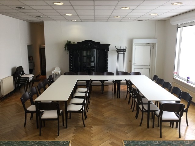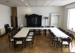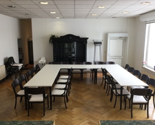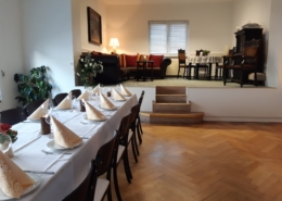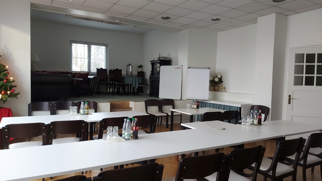 Der Raum (75 m2), ein ehemaliger Tanzsaal mit Bühne, ist für max. 30 Personen geeignet. Herrenzimmer-Möbelelemente schaffen ein ganz besonderes Ambiente.