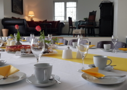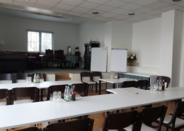 Es gibt eine kleine Küche mit E-Herd, Ofen und Geschirrspüler. 2 Kühlmöglichkeiten stehen für Ihre Speisen und Getränke bereit. Eine Ausstattung an Geschirr, Besteck und Gläsern ist vorhanden. WLAN-Zugang und eine Beamer-Leinwand (2,40 x 240 m) für Präsentationen ist inbegriffen. Unseren Außenbereich mit Tischen und Stühlen können Sie ebenfalls nutzen.